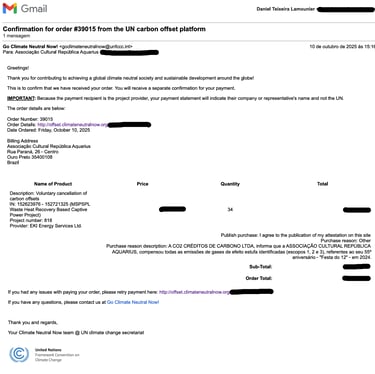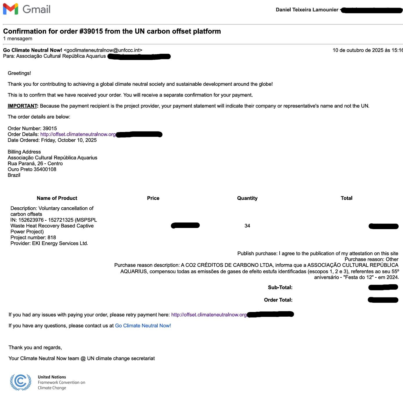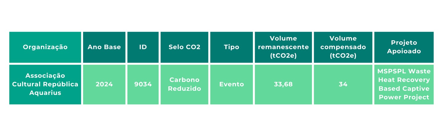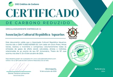 Este selo demonstra que a Associação Cultural República Aquarius não apenas calculou suas emissões através de um inventário GEE, mas também compensou através de créditos de carbono.