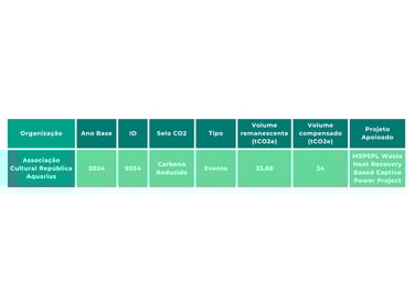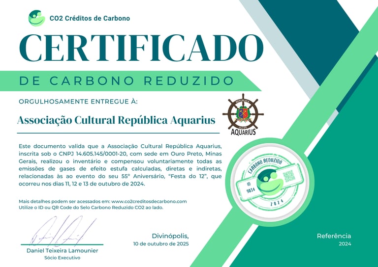 Durante a comemoração do 55º aniversário da instituição, nos dias 11, 12 e 13 de outubro de 2024, a Associação Cultural República Aquarius obteve pela segunda vez o Selo Carbono Reduzido CO2, ao medir, reduzir e compensar as emissões do evento que ocorreu em sua própria sede, com a presença de 63 ex-alunos e convidados(as).
